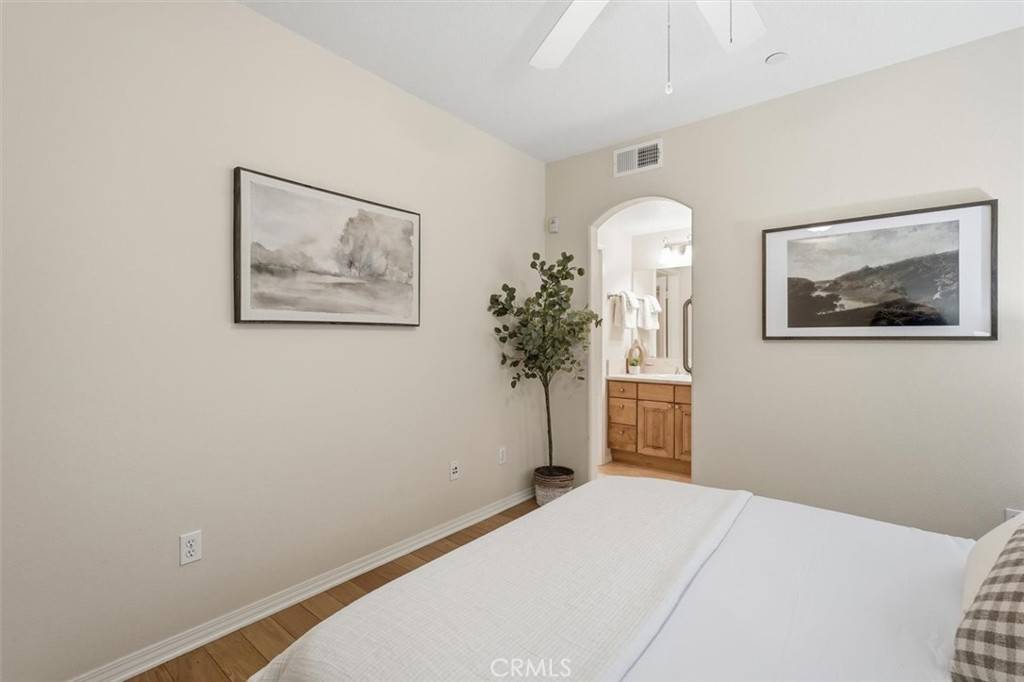The primary bedroom boasts an ensuite bathroom and generous walk-in closet, while the second bedroom is bright and airy with its own attached updated bath. Additional conveniences include two tandem parking spaces in the gated garage and a private storage unit.