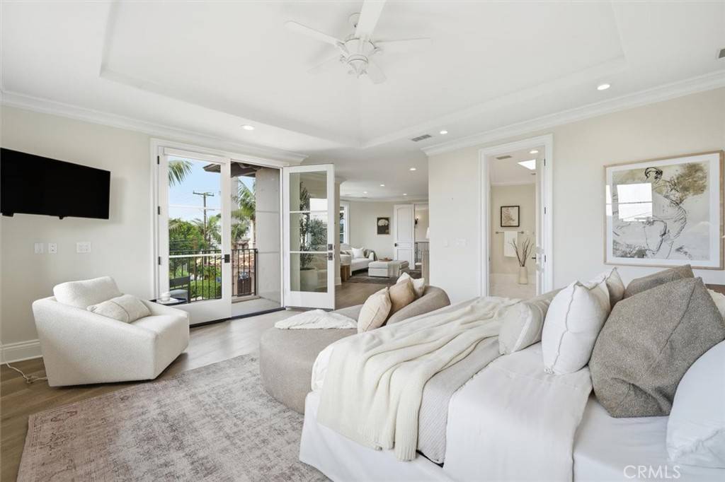 Blending timeless European charm with a relaxed Southern California lifestyle, the home features five spacious bedrooms and panoramic ocean views from both the private primary retreat and the upstairs family room.